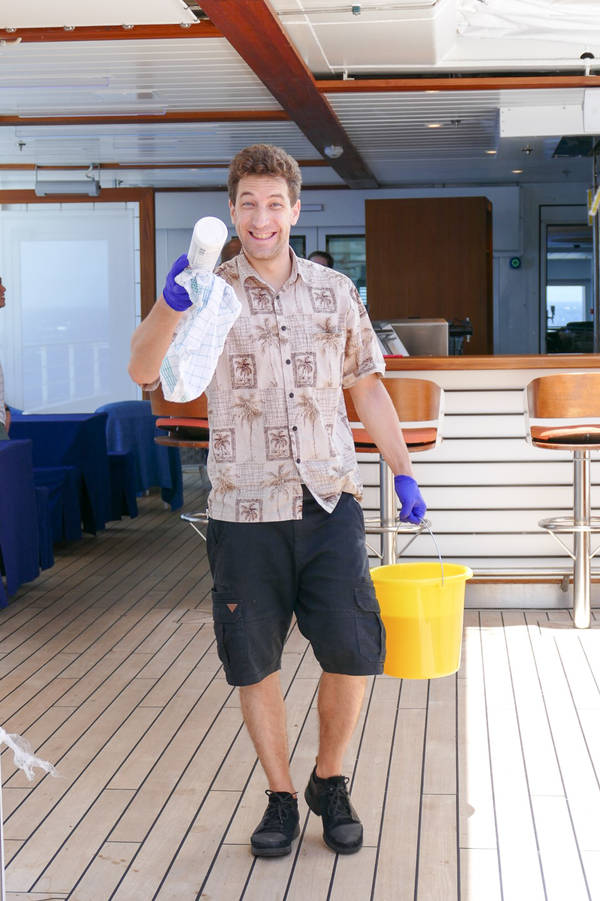 Zur Passage des Panamakanals haben wir noch einmal die Uniform hervorgeholt. Ansonsten dominieren Overalls oder andere zweckmäßige Arbeitskleidungen. Ab 1700 Uhr darf es dann auch mal Badekleidung sein. Die Passagierbereiche sind auf dieser besonderen Reise zum Teil auch für die Crew geöffnet, und das Pooldeck erfreut sich in tropischen Regionen großer Beliebtheit.