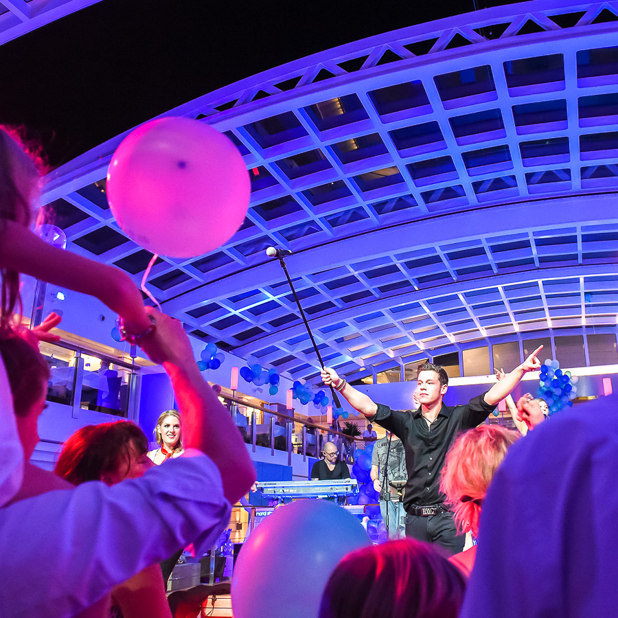 Live-Musik der Bordband in kleiner Besetzung zum Abendessen, mit viel Power als „Tribute to Robbie Williams“ zur späteren Pool-Party mit dem Auftakt-Song: „Let me Entertain you“. Nach der kurzen Ansprache durch Captain Christian van Zwamen marschierte die Besatzung auf die Poolbühne, jeder trug einen Luftballon in der Hand. Tosender Applaus der mehr als 470 Gäste an Bord. Anschließend wieder „Robbie Williams“ – 3 Zugaben wurden am Ende gespielt. Gäste feierten und tanzten. Zum Abschluss legte DJ Jay Walkin auf. Ein grandioser Abend im Hafen von Rhodos. Und ein wundervoller Auftakt zur Fahrt in das nächste Jubiläum.