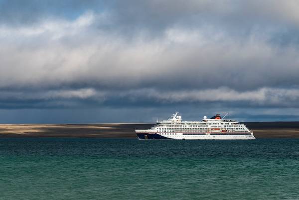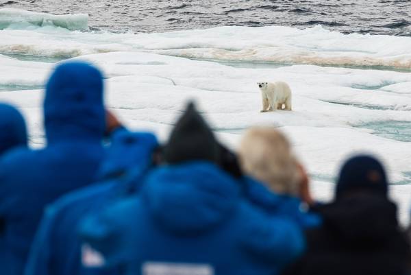 Schon in der Kabine werfe ich schnell einen Blick aus dem Fenster und mache mir einen ersten Eindruck von Wind, Wellen und eventuellem Nebel. Dann geht’s nach oben in die Observation Lounge für einen dampfenden Milchkaffee. Hier hat man bereits einen guten Rundumblick und trifft auf erste, frühe Gäste. Aber auf der Brücke stehen die besten Ferngläser, also statte ich dem wachhabenden Offizier einen Besuch ab. Auch unsere Bärenwächter haben sich dort bereits eingefunden, um das Ufer nach Eisbären abzusuchen. In der Anfahrt auf Strzelecki Harbour konnten wir Bär Nummer sechs in den Klippen ruhen sehen. Später erspähten wir nahe des Ufers etliche weiße Rücken im Wasser – Belugawale. Der Kapitän fuhr das Schiff in die geschützte Bucht. Als erstes gehen die Bärenwächter an Land und überprüfen die Gegend. Dann folgen die Experten und anschließend die Gäste. Hier sahen wir bereits einige Wale im Wasser. Wenig später wurde der Anblick spektakulär: Mindestens 100 dieser weißen, hocharktischen Belugawale zogen am Ende der Bucht ihre Runden und waren wunderbar zu beobachten. Solche Erlebnisse vergisst man nicht mehr.