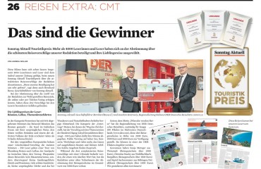 Traditionell zeichnet die Wochenzeitung Sonntag Aktuell auf der Reisemesse CMT in Stuttgart die besten Reisekonzepte des Jahres aus. Zum ersten Mal wurde der Touristik-Preis von den Lesern entschieden. In der Kategorie "Der Weg ist das Ziel" ging die Auszeichnung an die Themen-Reisen von Hapag-Lloyd Kreuzfahrten