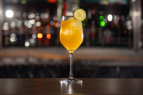 Dieser Drink ist ein Sonnenuntergang im eleganten Weißweinglas: Jose Cuervo Especial Gold, Cointreau, Limettensaft, Orangensaft, Holunderblütensirup und ein Hauch Orange Bitter. Aufgegossen mit Jacquart Rosé und garniert mit einer getrockneten Orangenscheibe.