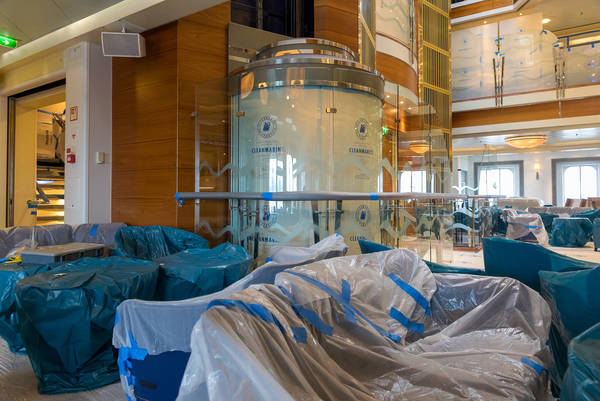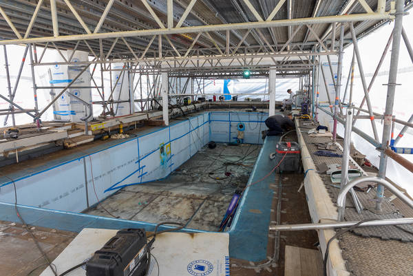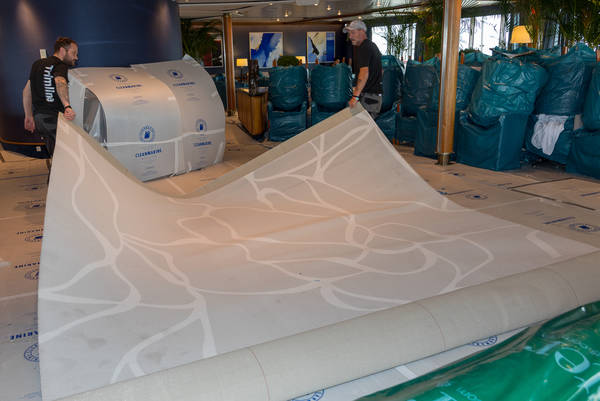 Die Gäste dürfen sich freuen auf ein Touch Up für 132 Suiten in den Kategorien 1-5 auf Deck 5, 6 und 7. Diese erhalten ein frisches Farbkonzept, neue Sessel, Sofas und Teppiche. Immerhin 4.000 Quadratmeter werden verlegt! Auf dem Pooldeck laden schon bald neue Lounge-Möbel und noch mehr Platz zum Entspannen ein – perfekt für eine Runde Sonnenbaden am neuen Pool des Schiffes. Das 16 Tonnen schwere Becken schwebte vor ein paar Tagen per Kran auf das Schiff. Dafür musste das Dach über dem Pooldeck kurzzeitig weichen. Aber nicht nur die Gäste profitieren von den Neuerungen: Die Crew darf sich auf eine vergrößerte und neu gestaltete Messe freuen.