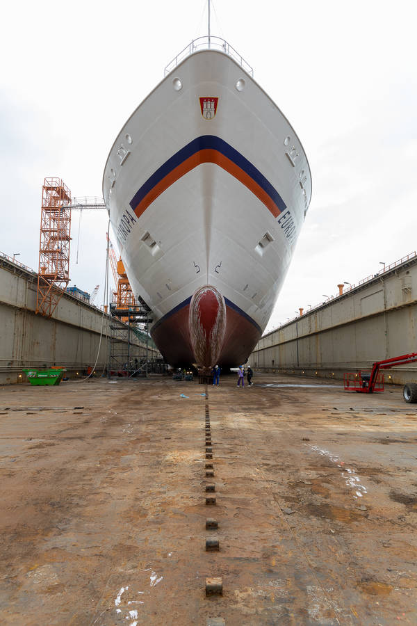 Statt Gästen in schicker Abendrobe für das Dinner, beherrschen Arbeiter in Blaumännern und mit Schutzhelmen die Szene. Überall stehen Gerüste und Hebebühnen, Schweißfunken fliegen durch die Luft, Kräne drehen sich geschäftig. Seit dem 13. September liegt unsere EUROPA im Schwimmdock der Lloyd Werft in Bremerhaven. Majestätisch thront das kürzlich vom Kreuzfahrt Guide prämierte Schiff auf den Pallen, umgeben von einem summenden Meer aus Werkzeugen, Maschinen und fleißigen Händen.