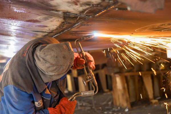 Wo heute noch Baustellenatmosphäre herrscht, lassen bald schon die Gäste die Seele baumeln. Aktuell ist das nur schwer vorstellbar. Funken fliegen hinter dem Rücken von Ulrich Voss auf während er erklärt, wie ein solches Projekt angegangen wird. „Die großen Pläne wie den genauen Zeitraum klären wir gut zwei bis drei Jahre vorab“, sagt Voss. „So blicken wir aktuell schon auf die Werft 2027/2028. In die Details gehen wir dann etwa zehn bis zwölf Monate vorher.“