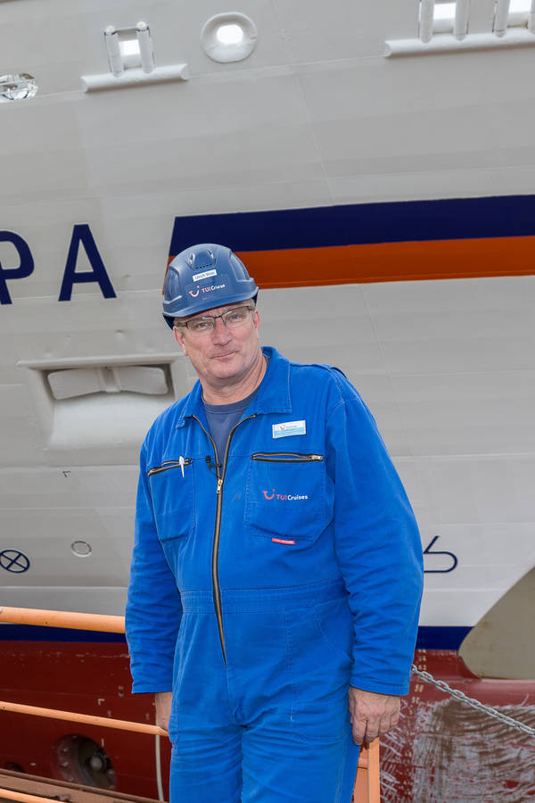 Jeden Tag sind dafür zwei wichtige Meetings anberaumt. Morgens wird geklärt, welche Arbeiten für den Tag anstehen. Abends geht es darum, was geklappt hat, und welche die nächsten Schritte sind. Ulrich Voss ist ein Meister für solche XXL-Projekte. Als Director Shipmanagement & Hotel Refurbishment hat der „Dry Dock Leader“ das Kommando über die Werftzeit der EUROPA.