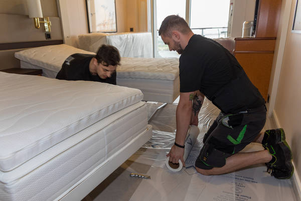 Bei den Renovierungsarbeiten in den Suiten der EUROPA kommt auch das Thema Nachhaltigkeit nicht zu kurz. „Wir modernisieren insgesamt 132 Suiten“, sagt Victoria Müller, Sustainability Managerin TUI Cruises. „Statt die alten Möbel zu entsorgen, spenden wir sie.“ So finden die Sofas und Sessel aus den renovierten Suiten ein neues Zuhause, ebenso die Stühle aus der Crew-Messe, rund 1.000 Kopfkissen und 600 Bettdecken. Alles geht an die Organisation „Der Hafen Hilft!“.