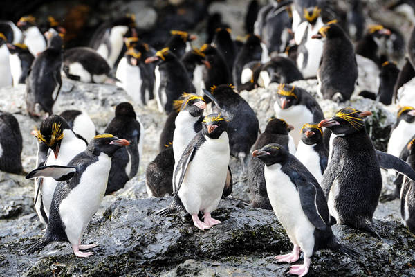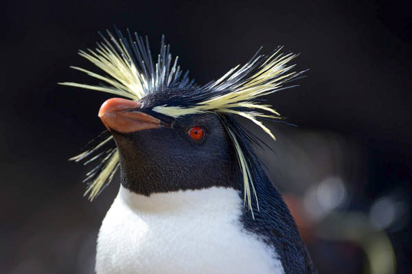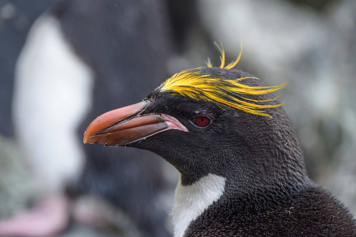 Die „kleinen Punker“ unter den Spheniscidae sind die Felsenpinguine. Punker? Die abstehenden, gelben Augenfedern geben den im Englischen „Rockhopper“ genannten Tieren ein eigenwilliges Aussehen. Mit einem Gewicht von 2,5 Kilogramm und einer Größe von maximal 60 Zentimetern zählen die Felsenpinguine zu den kleinsten dieser Vogelart. Ihre rosa-farbenen Füße hingegen gehören zu den größten. Damit hüpfen sie von Stein zu Stein und bewältigen verblüffende Höhenunterschiede. Felsenpinguine brüten in gemischten Kolonien zwischen Albatrossen und Kormoranen, vor allem auf den Falkland Inseln. Um ihren Nachwuchs kümmern sich die Partner abwechselnd. Rockhopper tauchen in bis zu 100 Metern Wassertiefe.