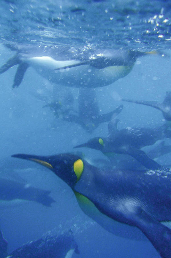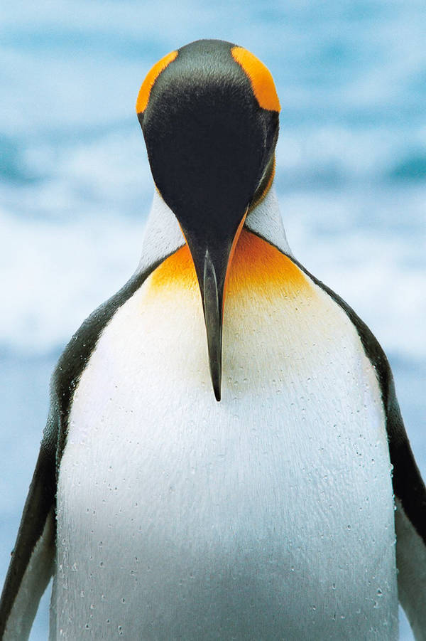 Der Königspinguin ist der zweitgrößte Vertreter seiner Art. Vom Nacken bis zum Schwanz ist das Gefieder silbrig grau-blau. Königspinguine brüten erstmals im Alter von sechs Jahren, die Aufzucht der Jungtiere dauert 13 Monate. Damit es das Ei schön warm hat, fällt den sich beim Brüten abwechselnden Elterntieren ein Teil ihrer Beinfedern aus – und das Ei hat so direkten Körperkontakt. Für die Futtersuche überwinden Königspinguine enorme Distanzen und kommen manchmal erst nach 60 Tagen wieder zurück zum Partner und dem gemeinsamen Küken. Große Kolonien von Königspinguinen gibt es auf den Falklandinseln und in Südgeorgien.
