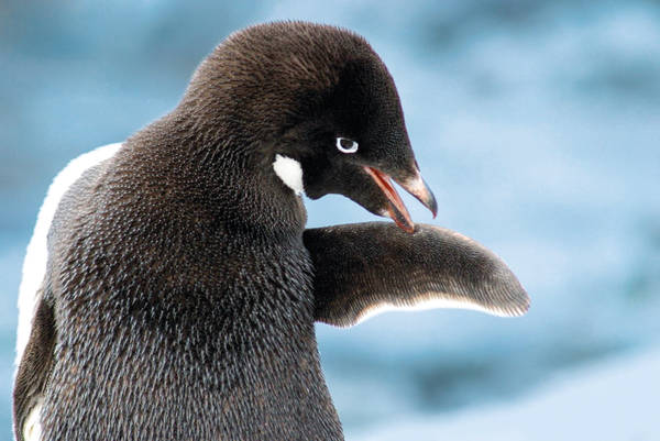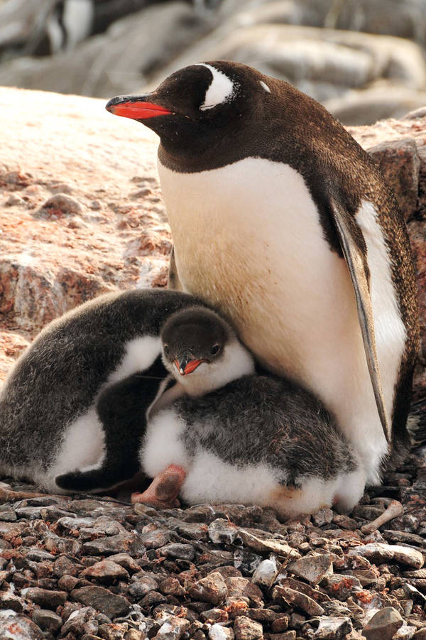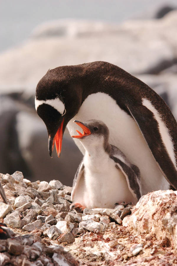 Adeliépinguine erkennt man an ihren langen Schwänzen, ihren charakteristischen schwarzen Köpfen, dem weißen Ring um die Augen und dem kleinen Schnabel. Diese Pinguine leben zwischen Schelfeisgrenze im Süden und Packeisgrenze im Norden der Antarktis. Mit einer Population von ca. 10 Millionen Brutpaaren sind die Adéliepinguine die am weitesten verbreitete und zahlenmäßig häufigste Pinguinart. Den französischen Namen verdanken sie dem Biologen Dumont d’Urville, der die Tiere als erster beschrieb und nach seine Frau benannte. Adeliépinguin-Pärchen brüten zwei Eier aus und begeben sich dann auf Futtersuche, während die Jungtiere der Kolonie einen Kindergarten bilden. Typisch für diese Art ist der Futterwettlauf: Kommen die Eltern zurück, watscheln ihnen die Jungtiere entgegen. Am Ende gewinnt nur eines und wird gefüttert, das andere geht leer aus.