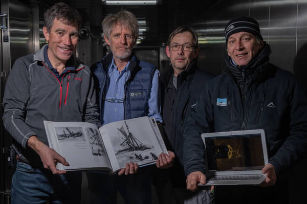 Dr. Stefanie Arndt: Wie an fast jedem Tag war ich auf dem Eis. Die Arbeit an Bord ist auf verschiedene Teams aufgeteilt. Nur das Subsea-Team – verantwortlich für die Unterwasser-Robotik – sitzt die ganze Zeit an den Monitoren, steuert die Operation mit dem Sabretooth und hat so die Entdeckung live mit erlebt. Wir alle anderen wurden später zu einem General Meeting einberufen und erfuhren dann: Das Wrack ist gefunden! Die Stimmung in dem Moment war einfach gigantisch. Freude in allen Gesichtern, wir sind uns in die Arme gefallen, haben einander beglückwünscht. Gleichermaßen war es surreal – zu wissen, dass die Suche nun beendet ist. Richtig berührt hat es mich am nächsten Tag. Unser Schiff war umgesetzt worden, wir arbeiteten auf einer Eisscholle, nur wenige 100 Meter entfernt vom Wrack der „Endurance“. Da erfasste man, was Manson Bound, der Historiker unserer Expedition meinte, als er sagte: „Wir spüren Shackletons Atem in unserem Nacken.“