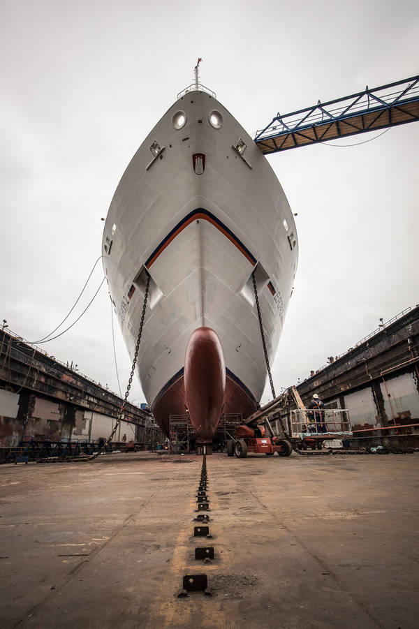 Halbzeit beim diesjährigen Werftaufenthalt der EUROPA 2 in Hamburg. Das 27.000 Tonnen schwere Schiff ruht auf ungezählten Pallen. Die Stabilisatoren sind ausgefahren. Hebebühnen stehen am eleganten Rumpf. Arbeiter schweißen, hämmern, schrauben, tragen Farbe auf. Besonders aufwändig ist der Austausch eines Wäschetrockners. Das Gerät ist zu groß, als dass man es einfach in das Schiff tragen kann wie man es zu Hause täte. Es muss ein Loch in die Außenwand geschnitten und nachher sorgfältig wieder verschlossen werden. Weniger spektakulär aber nicht minder konsequent erfolgen weitere Arbeiten, die so nur erledigt werden können, wenn das Schiff für eine gewisse Zeit an einem Ort liegt: In vielen Suiten werden Teppiche, Tische und Schränke getauscht. Auch im Crew-Bereich wird viel getan: neue Matratzen, neue Fitness-Geräte. Das sind keine sichtbaren Neuerungen für den Gast. Aber sie stehen für das unbedingte Bestreben, selbst gesetzten Ansprüchen zu genügen.