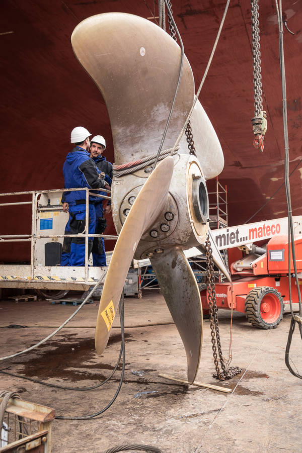 Alle zwei Jahre kommen die Schiffe von Hapag-Lloyd Cruises in die Werft, alle zwei Jahre wird renoviert, modernisiert, und es stehen Wartungsarbeiten an. Bei letzteren gehe es, so der Kapitän der EUROPA 2, nicht darum, defekte Bauteile auszutauschen. „Viele mechanisch stark beanspruchte Komponenten haben eine fest gelegte Anzahl von Betriebsstunden“, sagt Christian van Zwamen. Er hat die Uniform mit den vier Streifen auf der Schulter gegen einen weißen Overall getauscht. „Manche müssen gewartet, andere ausgetauscht werden.“ Und schon wenn man das Dock 10 von Blohm + Voss betritt, sieht man einen der tonnenschweren Antriebspropeller an einem Kranhaken hängen. Konzentriert sind Werftarbeiter damit beschäftigt, ein glänzendes Lager einzupassen.