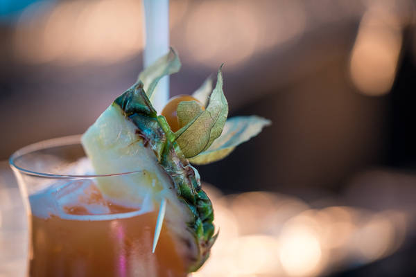 Ein Hurricane-Glas mit etwas Eis befüllen und auskühlen lassen. Die Zutaten nach und nach in einen ebenfalls mit Eis gefüllten Shaker geben, kräftig aufschütteln. Das Eis aus dem Glas nehmen und den Cocktail durch ein Sieb strainen. Er sollte eine schöne, rotbraune Farbe haben. Mit Ananas und Physalis dekorieren. Wir verwenden an Bord Recyclingstrohhalme.