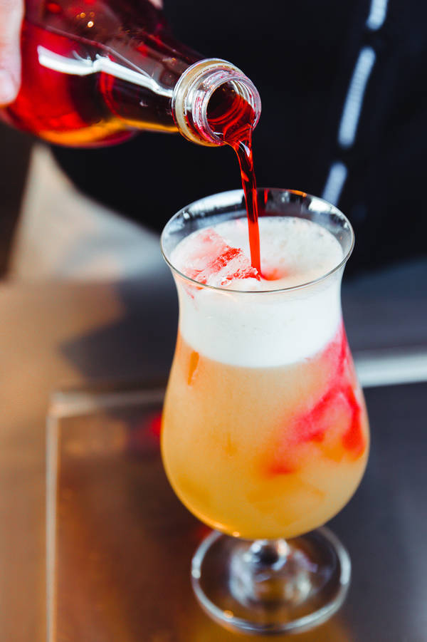 Eis in einen Shaker geben, die Säfte eingießen und für 10 Sekunden kräftig aufschlagen. Den Drink in ein mit Eis gefülltes Squall- oder Hurricaneglas gießen, ein Shot Grenadine hinzu. Zum Schluss ein wenig Garnitur.