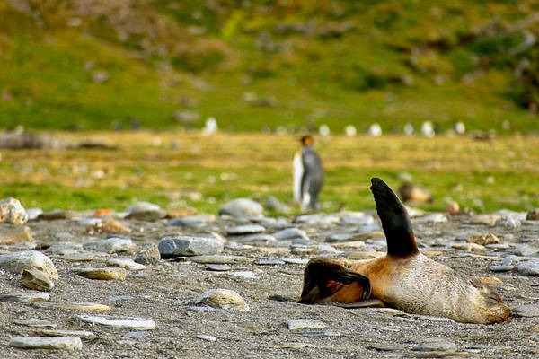 Plötzlich sind sie überall, schwimmend, springend, tauchend. Pinguine. Und an Land die Seebären. Frech und neugierig tollen sie umher, die Jungen rufen und blöken sich an, verwickeln sich in spielerische Kämpfe. Manchmal hüpfen sie mutig den Gästen entgegen. Im letzten Moment drehen sie ab. Dann sitzen sie da, blicken aus großen Augen – und kratzen sich genüsslich mit ihren Schwanzflossen den Bauch. Was ein wunderbarer Tag. Dazu der kalte, klare Wind, der einen manchmal fast umweht. Dann wieder Sonnenschein. Das Gefieder der Pinguine schimmert im Licht.