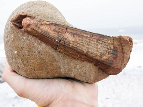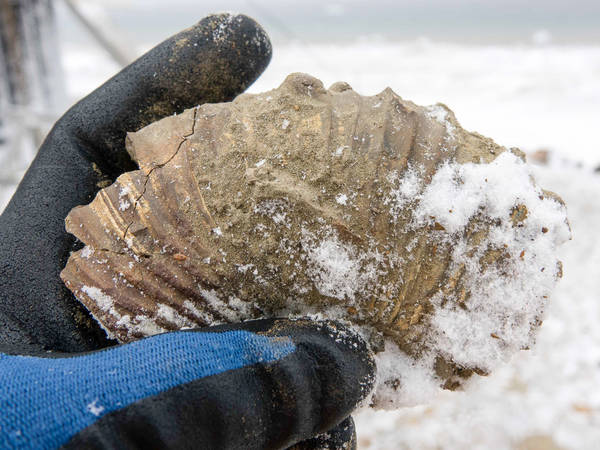 Vor der Hütte dann ein zweites Highlight. Nordenskjöld, selbst Geologe, ist ja nach Snow Hill Island gefahren, um die dort massenhaft vorkommenden Fossilien aus der Kreidezeit zu untersuchen. Direkt vor der Hütte liegen sie nun: Ammoniten, Brachiopoden, Schnecken, versteinertes Holz, eine versteinerte Languste und Muscheln. Fundstücke aus der Zeit der Dinosaurier und ein Outdoor-Fossilien-Museum allererster Güte. Hinter der Hütte zeigt sich die fantastische, geradezu mystisch-monochromatische Landschaft. Steil aufragende, mit Neuschnee überzogene Berge aus beigefarbenen Sedimenten, durchzogen von Basaltgängen, die durch die Verwitterung des weichen Steins zu steilen Türmen und Mauern herausmodelliert sind. Dazu ein grauer Himmel aus dem mal mehr, mal weniger Schneeflocken rieseln – und ein mit Eisblöcken übersäter Strand.