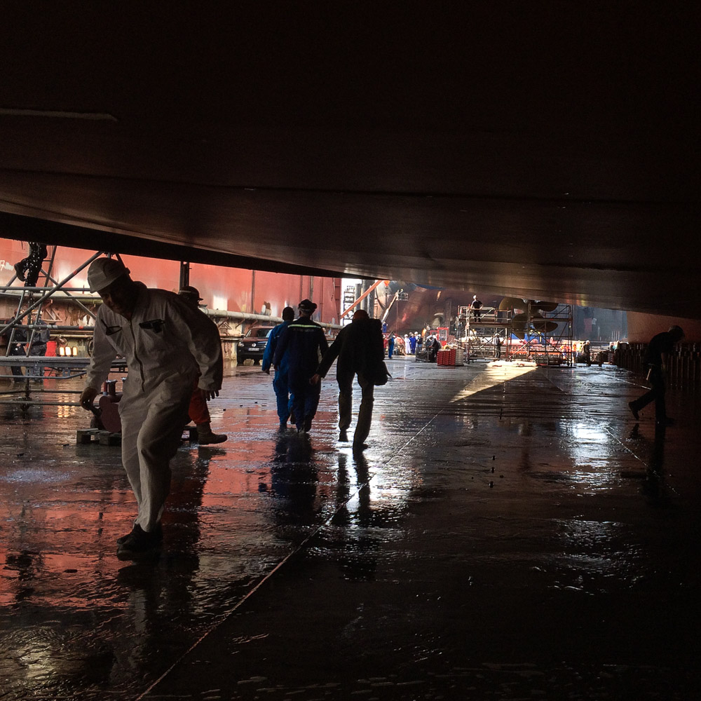 „Wir machen die Wartungsarbeiten, zu denen wir bei laufendem Betrieb nicht kommen“, sagt der Kapitän. Der Rumpf des Schiffes wird auf Algenbewuchs geprüft, gereinigt und gestrichen. Anker und Ketten, Schrauben und Ruder werden inspiziert, Rettungsboote und -inseln kontrolliert. Außerdem wird unter Deck renoviert und umgebaut: Wände werden gestrichen, Teppichböden ausgetauscht, Teile des Parketts erneuert. Die Familiensuiten sollen noch familientauglicher werden. Die Sansibar und das japanische Restaurant Sakura werden neu gestaltet (zu den weiteren Arbeiten in einem späteren Beitrag mehr). Kapitän Wolter: „Am 24. April wollen wir in neuem Glanz in die Nordsaison starten.“