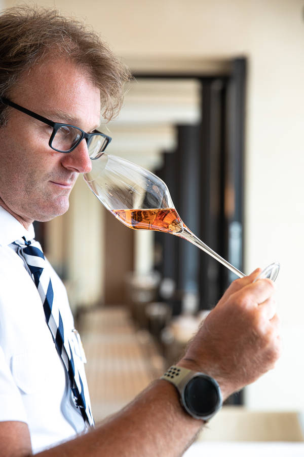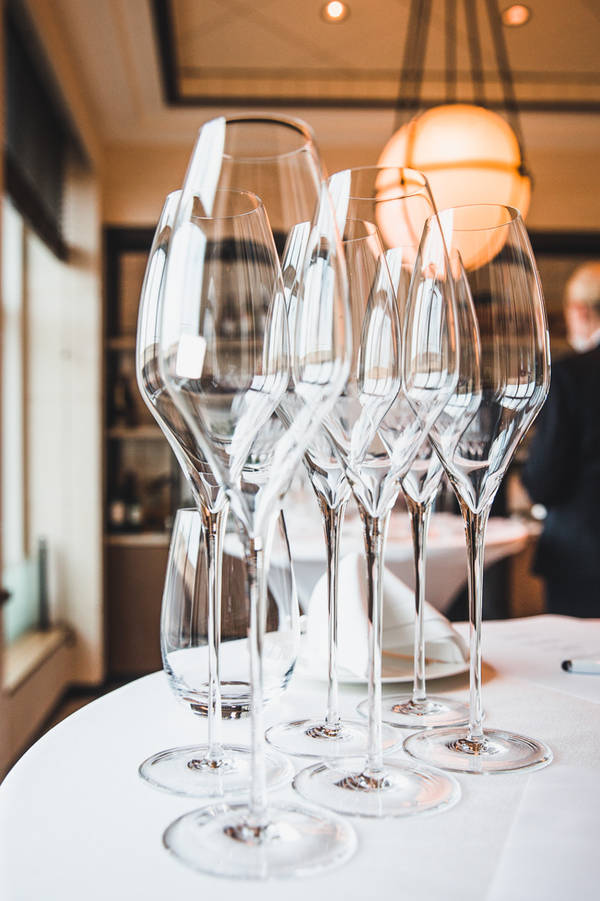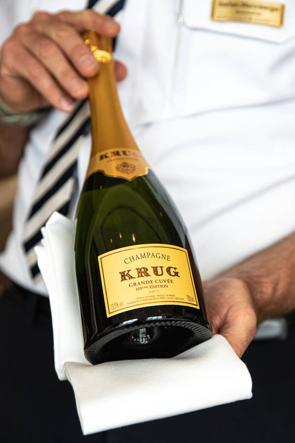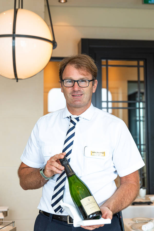Mehr als 2.000 Positionen umfassen die „Weinkeller“ an Bord der Luxusschiffe von Hapag-Lloyd Cruises. Stefan Mannberger, einer der Sommerliers der EUROPA 2, sagt nicht ohne Stolz: „Wir haben manche Rarität in den Lagerräumen auf Deck 2.“ Und diese würden auch getrunken. Während einer Reise herrsche ein besonderes Interesse für exklusive Weine und Champagner. Das merke er auch daran, dass die exquisiten Wein-Tastings, bei denen einige Flaschen der besten Güter weltweit vorgestellt werden, schnell ausgebucht sind. So auch dieses Tasting, bei dem Mannberger vor allem Sommer-Champagner vorstellt. „Eigentlich gibt es ja kaum eine bessere Zeit für diesen prickelnden Genuss.“