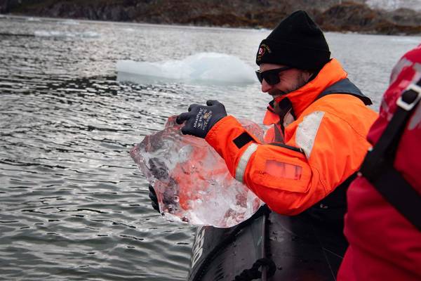 Es ist recht mild für einen Sommermorgen in der Región de Magallanes y de la Antártica Chilena. Das Thermometer zeigt 8 Grad, bei einer Wassertemperatur von 5 Grad. Es herrscht Windstille als Kapitän Axel Engeldrums Stimme durch die Bordlautsprecher ertönt. Man habe sich spontan dazu entschlossen, ein Zodiac auszusenden, um einen besonderen Fang zu machen: Gletschereis. Einige Brocken soll der kleine Trupp an Bord bringen. Gerade genug, um am Abend die Drinks zu kühlen – als exklusiver Gruß aus der Vergangenheit. Denn Gletschereis kann einige tausend Jahre alt sein. So lässt es sich genießend vortrefflich über die Zeit sinnieren, über die Welt, über die Schönheit der Natur.