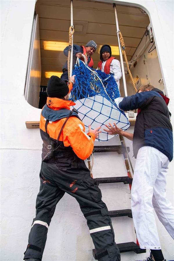 Von den Decks und den Balkonen ihrer Suiten sehen nun die Gäste zu, wie das Zodiac „Papeete“, gesteuert von Safety Officer Tobias Müller, aufbricht. Mit einem Netz käschern er und Kadett Alexander Schmitt einige schöne Brocken aus dem Wasser. Zwei große und drei kleine. Insgesamt 140 Kilogramm Eis. Mit Unterstützung einiger Matrosen wird es an Bord gewuchtet. Und alle Gäste freuen sich auf den Drink am Abend. Bis dahin hat das Schiff diesen zauberhaften Ort bereits wieder verlassen und sich auf den Weg gemacht nach Puñihuil. Die kleine Inselgruppe im Pazifik verfügt über den einzig bekannten Ort, an dem Humboldt- und Magellan-Pinguine gemeinsam brüten.