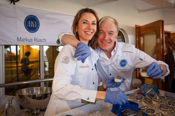 Verlockende Düfte liegen in der Luft. Es wird sautiert und gebraten, gedünstet und gerührt. Noch schnell ein paar Kräuter gehackt, mit der Pinzette eine Kornblume zurechtgezupft. Trüffel gehobelt, so dass üppige Flocken fallen. Die Gäste flanieren übers Pooldeck, staunen über die raffiniert dargebotenen Köstlichkeiten auf Tellern und in Schälchen. Vor den Ständen bilden sich gut gelaunte, sehr entspannte Schlangen. Es ist eine Vielfalt, die alle anspricht. Und das meistgehörte Wort ist eigentlich gar keines, sondern Ausdruck des Wohlgefühls: „Mmmmmhhh!“