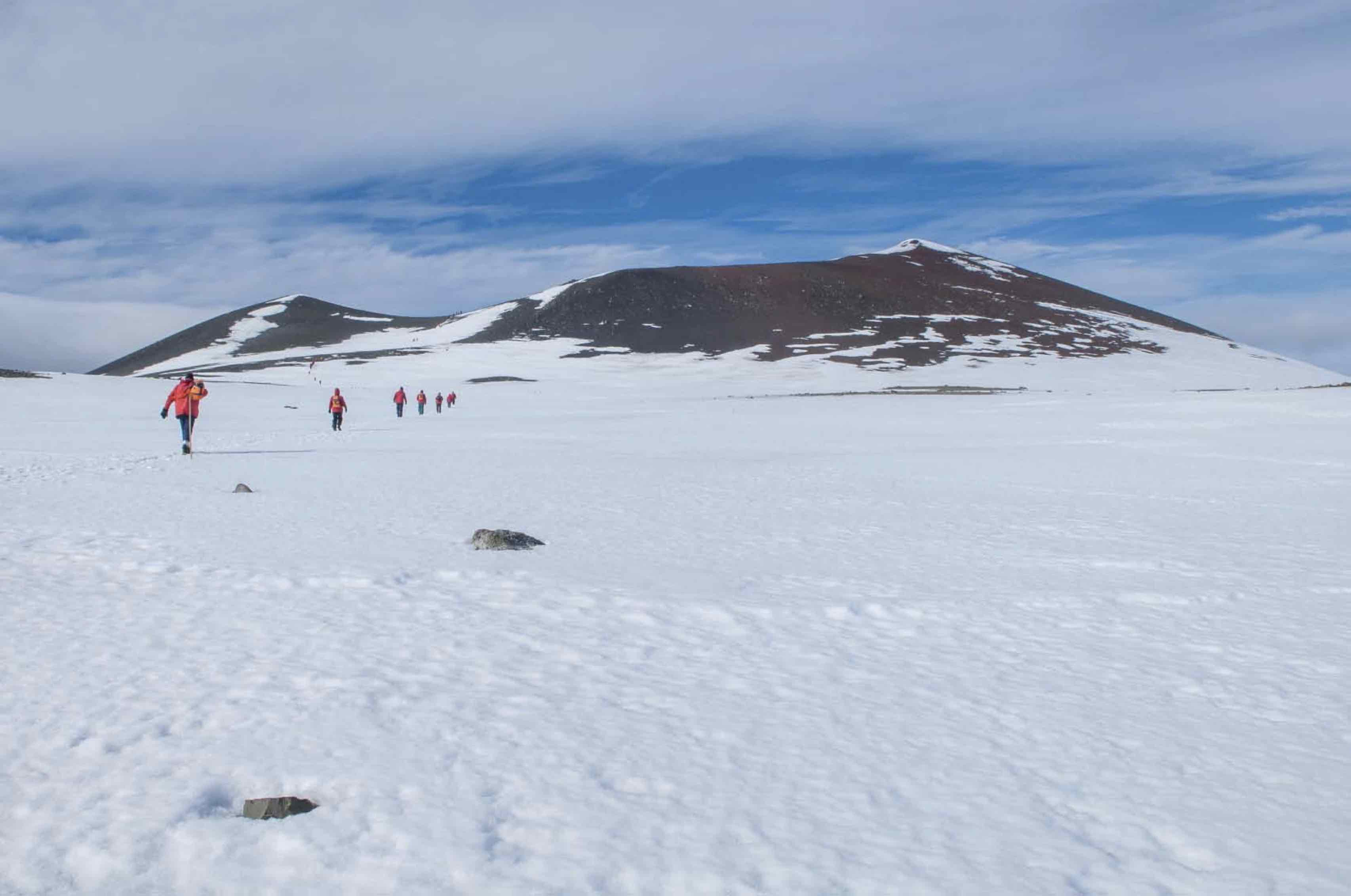 Morgens um 05:30 Uhr steckt Penguin Island noch im Nebel, zu Beginn der Ausbootung, anderthalb Stunden später, bietet sich ein ganz anderer Anblick, die Sonne scheint, blau-weiß glitzern die Gletscher. Die Anlandung auf der Vulkaninsel ist nicht ganz ohne. Große Basaltblöcke liegen am Strand, dazwischen Eisbrocken, alles bedeckt von rutschigem Schnee. Doch es hält nur wenige Gäste davon ab, an Land zu gehen und den 100 Meter hohen Kraterrand zu erklimmen. Von da haben wir einen grandiosen Blick hinein in den Krater, in dem sich ein kleinerer Sekundärkrater befindet, ein Basaltpfropfen verschließt den Zentralschlot. Ein besonderer Einblick.