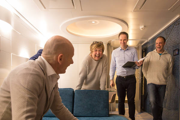 „Heute zeigt sich, wo wir stehen“, sagt Karl J. Pojer, Vorsitzender der Geschäftsführung von Hapag-Lloyd Cruises. Er sitzt neben Isolde Susset, Leiterin Produktmanagement Expedition Cruises, und zieht die blauen Plastiküberschuhe über. Dann folgen Susset und Pojer dem Neubau-Team. Zuerst geht es in die Junior Suite, die präsentiert sich mit geräumigem Bad, mit getrenntem Schlaf- und Wohnzimmer, mit großer Veranda. Die Standardkabine ist kompakter, heller, verfügt aber ebenfalls über eine Veranda. Das Neubau-Team hat alles für diesen Tag vorbereitet, sie erklären Gestaltungsideen und Bedienkonzepte, sie zeigen Lösungen, die gut funktionieren, und verweisen auf Klärungsbedarf. Denn manches stellt sich im Maßstab 1:1 doch anders dar als in der Planung. Auch deshalb hatten alle durchaus Respekt vor diesem ersten Check der Kabinen und Suiten für HANSEATIC nature und HANSEATIC inspiration.
