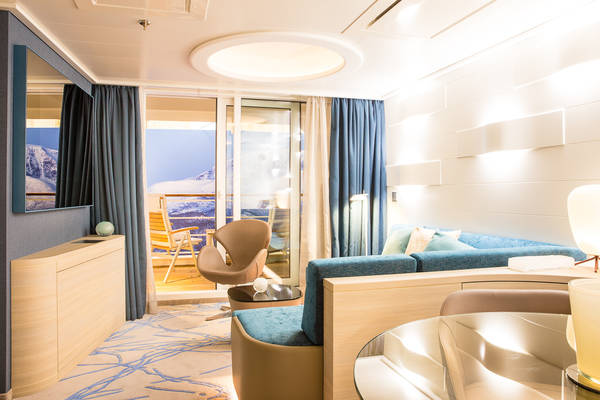 Ein kalter Wintertag im Fjordland Norwegens, eine Stunde nördlich von Ålesund. Die Vard-Werft betreibt hier mehrere Produktionsstandorte. In einer Halle stehen die Prototypen der ersten Kabinen für die neuen Expeditionsschiffe von Hapag-Lloyd Cruises. Es ist ein seltsamer Anblick – eine Produktionsstätte voller Apparate und Baumaterialien. In der Mitte eine Art Container, den man nur mit Überschuhen betreten darf, um nichts schmutzig zu machen. In der Kulisse perfekt eingerichtet, eine Kabine und eine Suite. Frischer Teppichboden wurde verlegt, die Wände sind verkleidet, die Bäder funktionieren, die Elektrik auch. Echte Flachbildfernseher, echte Vorhänge an den Fenstern, und auf den Balkonen stehen Sonnenliegen. Eine Mock Up-Kabine ist nicht nur maßstabsgerecht, sondern auch voll funktionstüchtig. Sie dient als Muster. Sobald die finale Freigabe vorliegt, werden alle Kabinen und Suiten nach ihrem Vorbild hergestellt. 1:1.