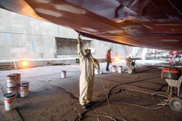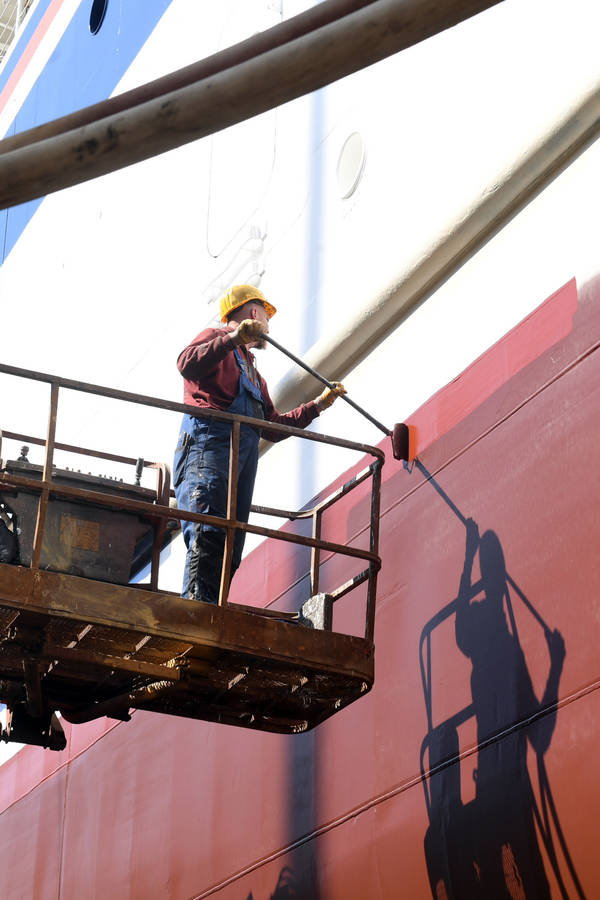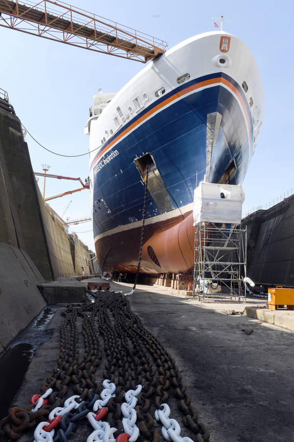 „Das gute Wetter spielt uns in die Karten!“ freut sich Kapitän Ulf Wolter und deutet auf den strahlend blauen Himmel. Er steht im Trockendock der Lloyd Werft in Bremerhaven, hat die Uniform mit den vier Streifen gegen einen weißen Overall getauscht. Hinter ihm ragt das Heck der HANSEATIC inspiration empor, Mitarbeiter der Werft tragen gerade den neuen Farbanstrich auf. Beim Gang um das auf Pallen ruhende Schiff wird die Dimension der Baustelle sichtbar. Überall wird gewerkelt, Wasser sprudelt, Funken sprühen, Gerüste und Hebebühnen ragen auf. „Das Bugstrahlruder wird gewartet, der Propeller geprüft, die Zink-Anoden erneuert, genauso wie das Grit, der Schutz für das Bugstrahlruder. Auch für die Stabilisatoren sowie die zwei Ruder und Propeller am Heck hat es einen turnusgemäßen Service gegeben“, zählt Kapitän Wolter auf. „Das ist nötig für die Erneuerung der Klasse. Der Prüfer schaut sich alles genau an.“