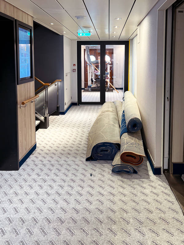 Neben den technischen Wartungsarbeiten stehen diverse Renovierungen an: im Bereich der Rezeption, im Treppenhaus, in den Fluren, auf dem Pooldeck, im OCEAN SPA, in den Kabinen und Suiten. Hier werden Polster erneuert, da Tapeten geklebt, Teppiche verlegt, Fliesen ausgetauscht. Isolde Susset, Leiterin Expeditionskreuzfahrten und Touristik, ordnet die Arbeiten ein: „Da die HANSEATIC inspiration 2019 in Dienst gestellt worden ist, sind noch keine größeren Umbauarbeiten nötig. Wir konzentrieren uns daher auf viele Kleinigkeiten. Aber wie sagt man doch so schön? Viele kleine Teile ergeben auch ein schönes großes Ganzes.“ Sie blickt sich zufrieden um. „Selbstverständlich sind wir auch auf die Wünsche unserer Gäste eingegangen.“ Und mit einem Augenzwinkern fügt sie hinzu: „Manche sind umsetzbar und manche nicht. Wir haben die Anregung erhalten, die Bäder der Grand Suiten mit einer Fußbodenheizung auszustatten. Die wurde nun eingebaut. Auch haben wir das Feedback bekommen, dass die Schranktüren in den Kabinen und Suiten manchmal schwergängig waren. Alle Türen verfügen nun über ein neues Schließsystem.“