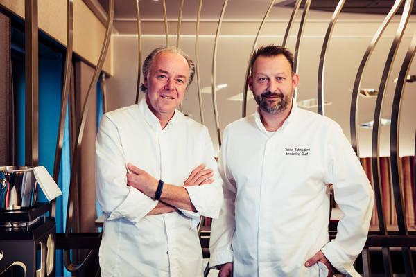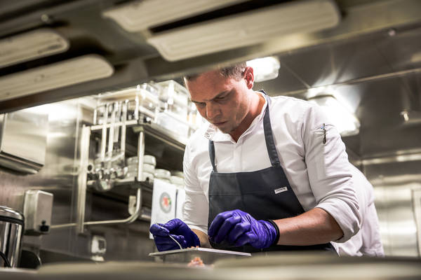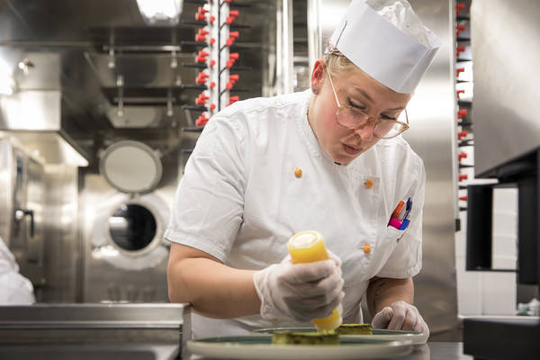 Hinter der Anrichte beugt sich Marie-Louise Kleemann, momentan einzige Frau im Küchen-Team und als Pastry Chef zuständig für die Desserts, über ein Bisquit. Sie hobelt ein Stück Baiser, arrangiert eine Fruchtmousse, verziert den Teller mit einem kunstvollen Strich Püree. Die Kollegen testen erneut, und schließlich klatscht man sich gegenseitig ab. Es herrscht ein guter Spirit an Bord. Es ist die Leidenschaft für eine besondere Reiseform. Und das schmeckt man.