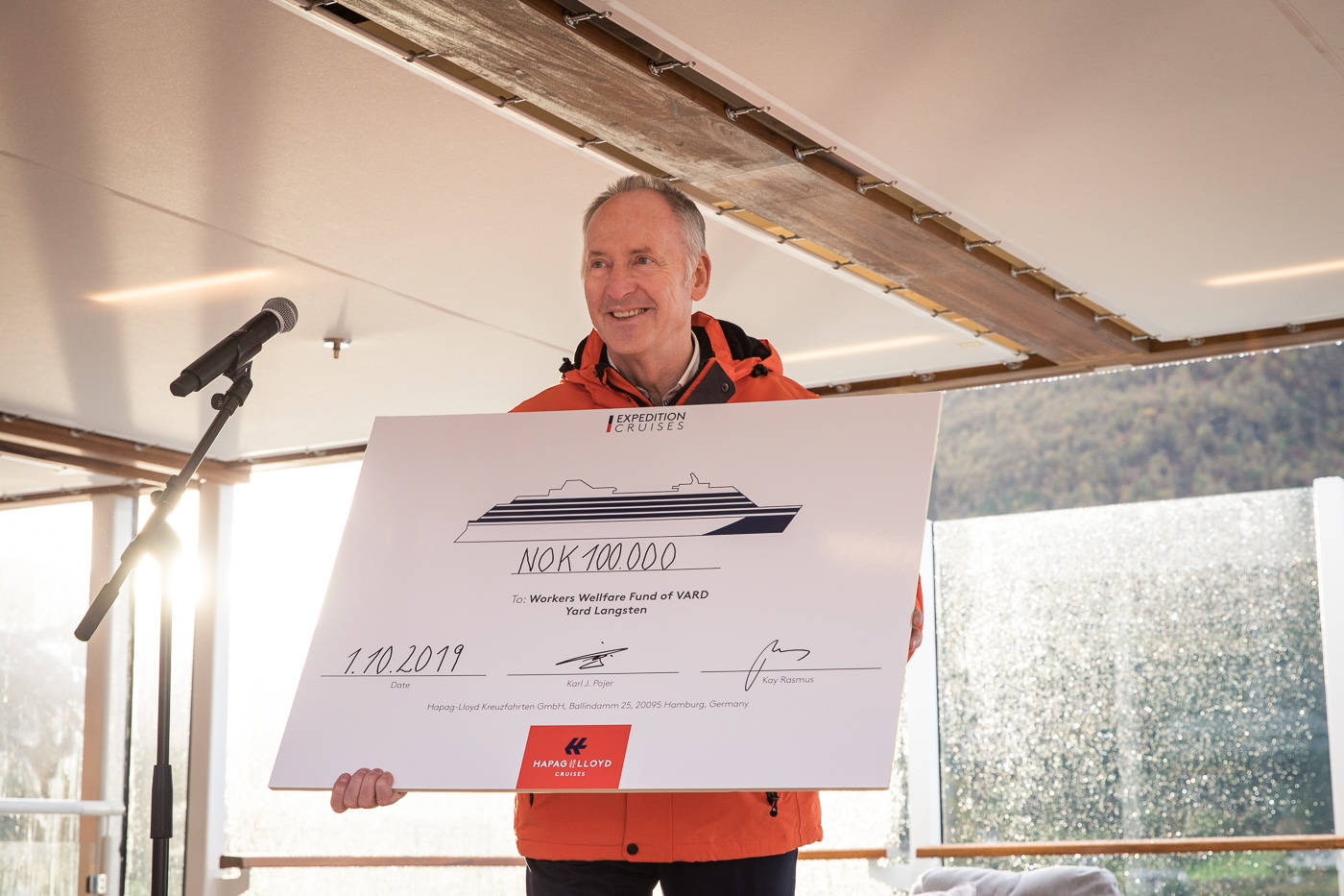 „The ship is ours!“ ruft Kapitän Ulf Wolter von der kleinen Bühne für die Übergabe-Zeremonie, die auf dem Pooldeck der HANSEATIC inspiration vor einem der beiden gläsernen Balkone errichtet wurde. Wie zum Triumph reckt er die orangefarbenen Mappe mit den offiziellen Papieren in den grauen Himmel über dem Tomrefjord. Das Wetter sei heute nicht so gut, hatte Karl J. Pojer, Vorsitzender der Geschäftsführung von Hapag-Lloyd Cruises, zuvor noch gesagt, „aber das Schiff ist sehr gut!“ Der Applaus der Anwesenden geht über in leisen Jubel.