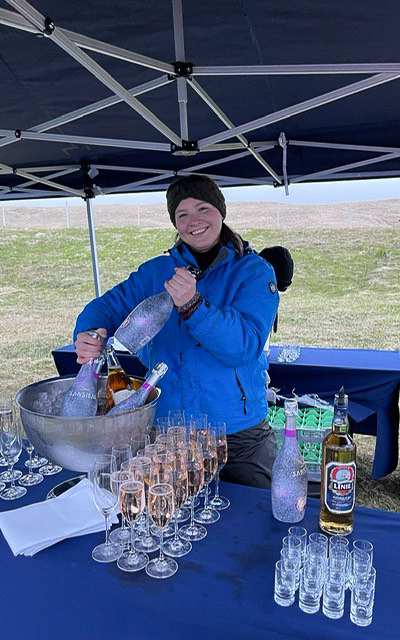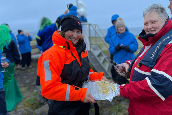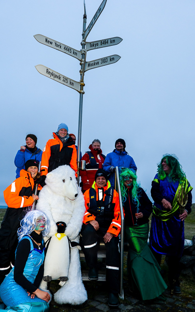 Ein Ort wie Grímsoy eignet sich natürlich perfekt für eine Polar-Taufe. Und so werden sofort nach Ankunft der HANSEATIC inspiration von der Besatzung mit den Zodiacs erst das Equipment an Land gebracht – und gleich danach die Gäste. Sie treffen am Polarkreismonument mit seinen in diverse Richtungen weisenden Entfernungsschildern (Tokyo 8.495 Kilometer, New York 4.450 Kilometer, Reykjavik 325 Kilometer) auf Neptun und sein Gefolge, die die Taufzeremonie mit einem Glas Aquavit besiegeln. Auch ein „Polar-Bär“ hat sich zu uns gesellt, um mit allen willigen Täuflingen für ein Erinnerungsfoto zu posieren. Die Stimmung ist fantastisch! Und nach der Zeremonie an Land wird an Bord weiter gefeiert – bis in die frühen, noch mittsommernachthellen Morgenstunden.