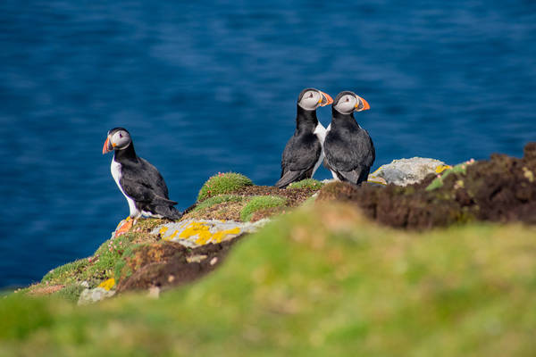 Große Wolken segeln durch einen unfassbar weites Blau, das Meer glitzert. Der Ornithologe sagt, dass wir großes Glück hätten mit dem Wetter. Eigentlich stürme es hier viel, selbst im Sommer steigen die Temperaturen selten über 15 Grad, gefühlt immerhin 17 Grad. Wir stapfen über eine moosige Wiese. Die Schafe bleiben erst neugierig stehen und springen dann davon. Eine von Flechten bewachsene Mauer teilt die Insel, auf der einen Seite die Tiere, auf der anderen die Landwirtschaft. Die Mauer verschwindet wogend in der Ferne.