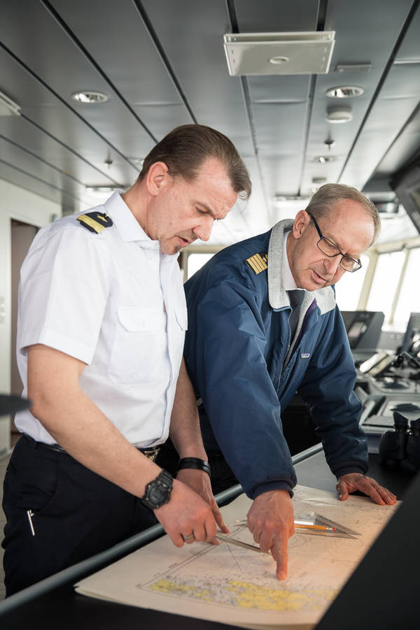 Normalerweise dauert die Übergabe zwischen zwei erfahrenen Kapitänen vier bis fünf Stunden. Man kennt sich, kennt das Schiff, kennt das Fahrgebiet. Man tauscht sich nur über die wichtigsten Vorkommnisse aus, alles andere steht im PC. Doch diesmal ist es anders. Das Fahrgebiet ist vertraut, doch die HANSEATIC nature für beide neu. Schon einige Tage bevor Kapitän Thilo Natke seinen Urlaub antritt, kommt Kapitän Axel Engeldrum an Bord. Immer wieder treffen sich die Kapitäne, die sich im Kommando abwechseln: stehen gemeinsam auf der Brücke, bei den Anlegemanövern nebeneinander auf der Nock, sie tauschen sich nachhaltig aus.
