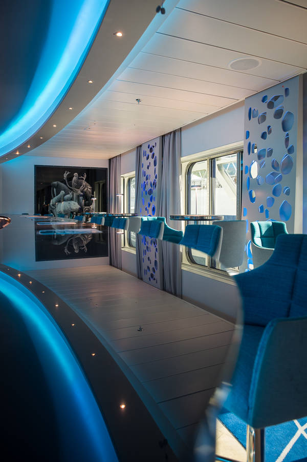 Unser Fotos zeigen Impressionen von Bord: das futuristisch anmutende Hanseatrium mit seinen wandfüllenden Displays und der im doppelten Wortsinne coolen Bar. Die gläsernen Balkone, die live schlicht spektakulär sind. Der sich durch die Treppenhäuser ziehende „Light Crack“. Die Marina.