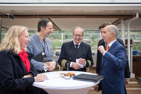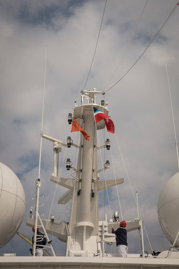 Zur eigentlichen Übergabe sitzen Vertreter der Werft und Hapag-Lloyd Cruises an einem Tisch. Karl J. Pojer und CFO Kay Rasmus unterschreiben unzählige Papiere. Shake hands. Und Glückwünsche der Mitarbeiter an Bord. Das Schiff gehört nun uns! Im Rahmen der kleinen Zeremonie spricht der Pfarrer einen Segen. Und dann wird die HANSEATIC nature umgeflaggt. Matrosen holen die Fahne Norwegens ein und hissen die von Hapag-Lloyd Cruises. Die Feier währt nicht lang, die Arbeiten auf den Decks laufen weiter. Es gibt viel zu tun. Und noch am Abend beginnt die erste Reise – nach Hamburg.