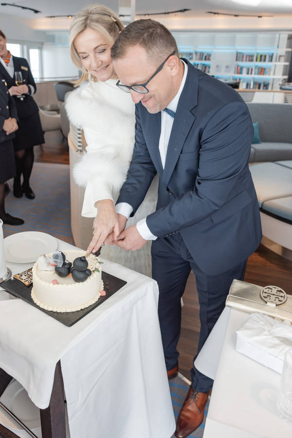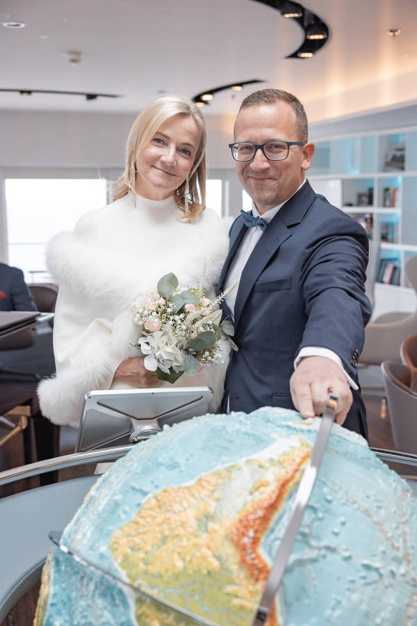 „Als nächstes hatten wir Kontakt mit der Wedding Plannerin. Die ist ja so lieb und wundervoll und hat sich um alles gekümmert“, sagt Karina. Was den Ablauf an Bord betraf, hatten Braut und Bräutigam nur einen Wunsch: eine Schokoladentorte. Dennoch gab es ein paar Details zu klären. Ein Wunschtag musste ausgewählt werden und – für alle Fälle – ein Ersatztag. Es mussten einige Formulare unterzeichnet werden. „Und wir wurden gefragt, ob uns Trauzeugen begleiten.“ Sascha lacht. Er wäre wohl spontan dabei, würde ein Freund auf so eine „verrückte Idee“ gekommen sein. Zurück zu Hause wollen die beiden in mehreren kleinen Festen ihre Hochzeit nachfeiern. „An Bord hatte man angeboten, uns Trauzeugen aus der Crew zu stellen. Ich habe gesagt, dass wir sicherlich auf der Reise jemanden kennen lernen. Und so war es dann auch.“