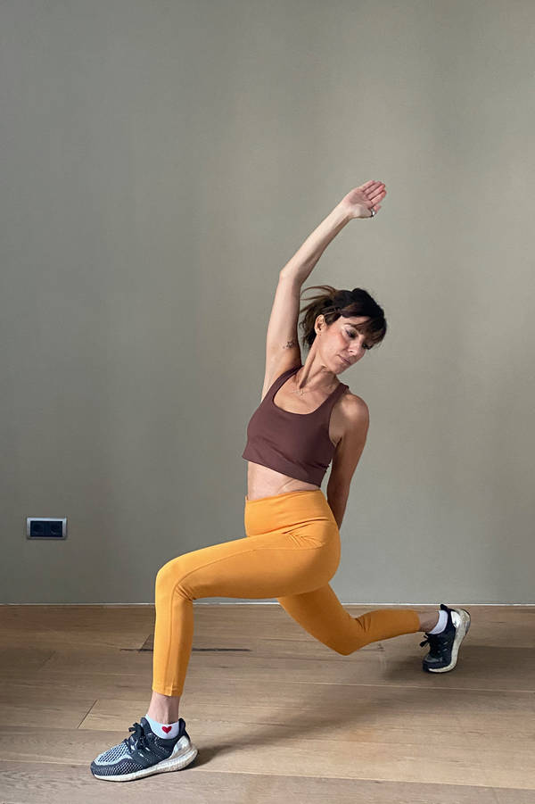 Die Übung: Wir stehen auf der Matte. Starte nun in einen Ausfallschritt, die Beine hüftbreit. Stelle den rechten hinteren Fuß auf, das Knie des linken Beines achsengerecht über dem Fußgelenk. Nun rotiert das Bein nach außen. Dabei gibst du etwas mehr Druck auf die Außenkante deines linken Fußes, ohne die Auflage deiner großen Fußzehe zu verlieren. Die Hüfte bleibt geöffnet, das Becken nach vorne gekippt, den Nabel ziehst du leicht ein in Richtung Wirbelsäule. Den rechten Arm streckst du diagonal nach oben aus. Die linke Hand legst du dabei auf deinem linken Bein ab, oder winkelst ihn hinter deinem Gesäß an. Der Blick folgt dem rechten Arm, ohne den Hals zu überstrecken. Atme nun ruhig über die Nase tief in die unteren Rippen und versuche durch ein verlängertes Ausatmen tiefer in die Dehnung zu sinken. Nimm dabei deine Atmung in deiner Flanke wahr. Nach einigen Atemzügen wechsele die Seite.