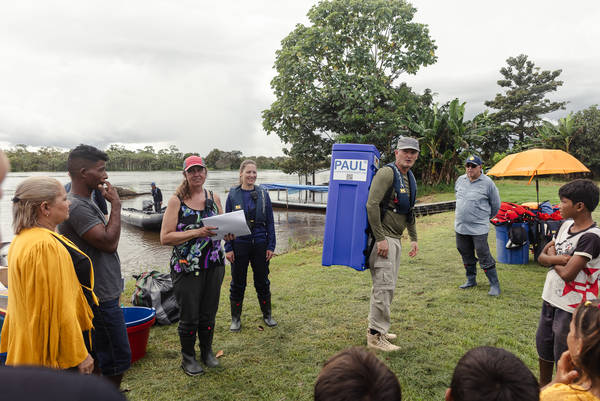 Die Übergabe der Wasserrucksäcke gehört zu diesen Besonderheiten. Seit jeher übernehmen unsere Expeditionsschiffe auf dem Amazonas auch die Funktion einer Einkaufshilfe. Bei der Fahrt flussaufwärts werden die Bewohner der entlegenen Dörfer gefragt, welche Alltagsprodukte ihnen fehlen. Dann wird in Iquitos eingekauft, vielfach mit Geld, das die Crew gesammelt hat. Und auf der Reise flussabwärt der Einkauf verteilt. Eimer, Schaufeln, Macheten, Schulbedarf. Während einer Amazonas-Expedition mit unserer HANSEATIC inspiration haben sich Susanne und Thomas Nöcker davon inspirieren lassen. Als sie in einer Schule am Fluss von Schwierigkeiten mit der Trinkwasserversorgung erfuhren, beschlossen die Gäste, dem Dorf – und einigen anderen – einen PAUL zu spenden (in diesem Interview mehr dazu). Im Namen aller Beteiligten verteilen Kapitän Ulf Sodemann, General Expedition Managerin Wilma Rehberg und die Crew die großen blauen Wasseraufbereiter. Und bauen sich auf zum Gruppenfoto.