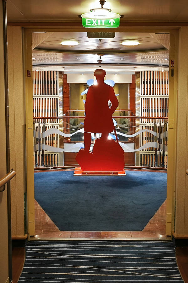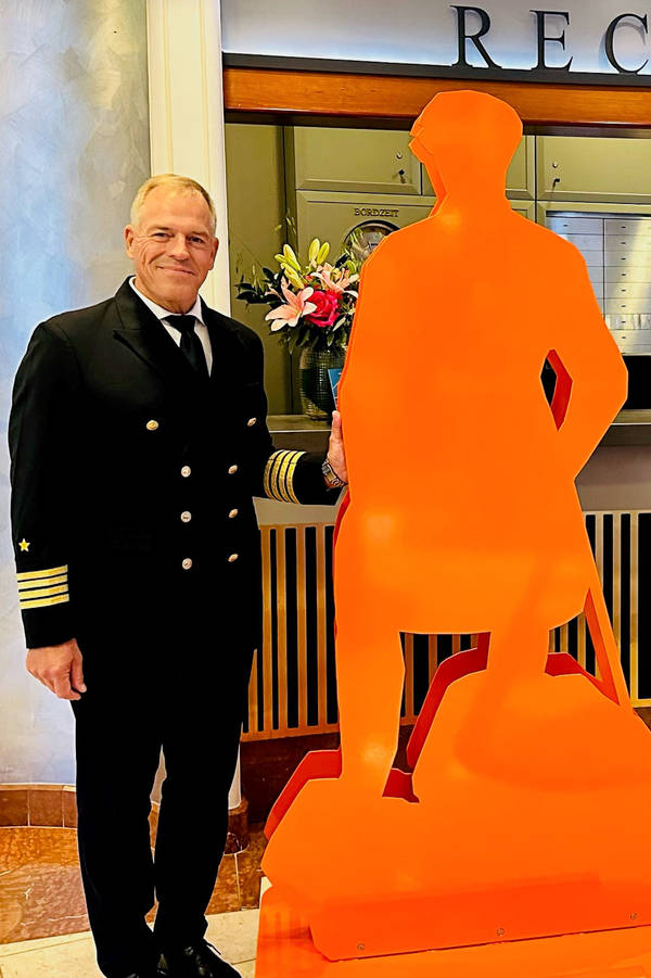 Allein und zu Fuß würde der Wanderer nicht weit kommen. Nicht nach Island, nicht nach Boston oder Tromsø, ja noch nicht einmal an Bord. Unterstützung erfährt er von der Crew, die ihm tatkräftig unter die Arme greift und ihn – gemeinsam mit MS EUROPA Kapitän Jörg-Peter Berendsen – schließlich im Atrium des Schiffes Willkommen heißt. Später soll die orangefarbene Figur an Deck stehen, den Blick schweifen lassen und romantisch in die Ferne schauen.