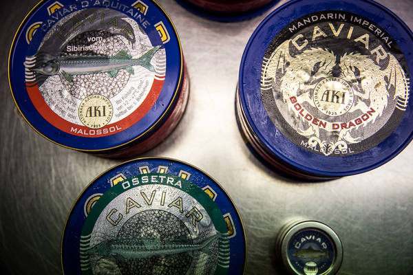 Markus Rüsch stellt nun vier Dosen auf den Tisch. Jede enthält ein Kilogramm Kaviar. Virtuos macht sich Rüsch daran, die erste Dose zu öffnen. Er lässt das breite, dunkelrote Gummiband abspringen, dann klopft er mit dem Griff des Messers auf den gold-blauen Deckel. Nun schiebt er die Messerscheide senkrecht zwischen Deckel und Korpus, hebelt die Dose ein wenig auf, so dass sie sich vorsichtig öffnen lässt. Kein einziges Kaviar-Korn fällt daneben. Glänzend und anthrazitfarben ragt der Inhalt auf. Das schwarze Gold. Markus Rüsch sagt lachend: „Ich liebe diesen Duft – nach Seeluft.“