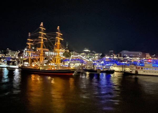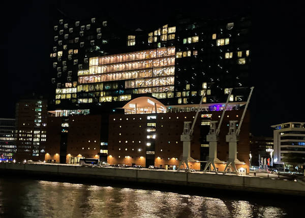 Bye bye, Hamburg! Wir begleiten die EUROPA auf dem ersten Stück ihrer Weltreise. Und wir lassen uns zu Beginn auch so viel Zeit wie Weltreisende, wir genießen den Begrüßungs-Champagner und sitzen zum Abendessen lange im Lido Café. Gegen 21:30 Uhr legt das Schiff ab. Auf der Pier hat sich ein kleines Verabschiedungskommitee versammelt. Denn die EUROPA verlässt heute Hamburg auf lange Zeit, erst im Juni nächsten Jahres kommt das Schiff zurück. Es wird viel gewunken, das Typhon ertönt, und langsam gleitet das Schiff auf die Elbe. Ein Gewitter zieht auf, es donnert, regnet aber kaum, dafür sorgen die Blitze für eine mystische Szenerie. Später heißt es per Borddurchsage, dass wir während der ersten Tage mit Seegang rechnen müssen.