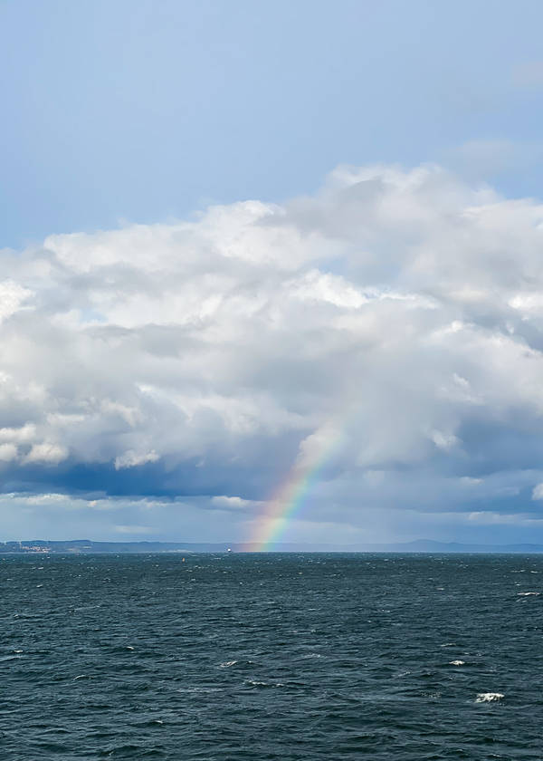 Dùn Èideann ist der gälische Name der schottischen Hauptstadt. Mit dem Tender geht es aber erst einmal nach Newhaven, wo uns Dudelsack-Klänge begrüßen. Ein Bus bringt uns nach Edinburgh. Es ist schön, wieder Land unter den Füßen zu haben. Wir schlendern durch die Straßen rund um das Castle, das hoch über der Stadt thront. Die Royal Mile führt uns weiter zum Holyrood Place. So sehr die Stadt mit ihrer historischen, pittoresken Architektur ihrem Spitznamen „my old romantic town“ folgt, so sehr ist sie eine dynamisch wachsende Großstadt mit mehr als 500.000 Einwohnern. Die „Growing time“ von 1903 ist die erste Blumen-Uhr der Welt. Beim Auslaufen werden wir mit einem Regenbogen beschenkt.