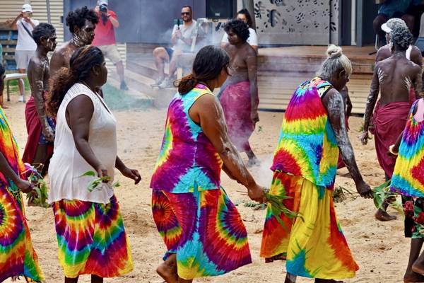 Am Australia Day lädt uns Hapag-Lloyd Cruises in die Künstlerkolonie Yirrkala ein. Die rund 1.000 Menschen der Aborigine-Gemeinde gehören fast alle dem Stamm der Yolngu an. Es soll hier auch noch ein Mitglied der Band Yothu Yindi leben. Ihr Aborigine Rock mit Didgeridoo-Klängen hat mich in den 1990er-Jahren sehr beeindruckt. Und ich hätte ihm gern gedankt für die schönen Momente, die er mir mit seiner Musik geschenkt hat. Doch offenbar ist er weiter gezogen. Stattdessen erleben wir vor dem Art Center eine unglaublich lebendige Folkloregruppe, sie spielen Musik, tanzen und zeigen typische Rauchzeremonien. Anschließend erkunden wir die Galerie und den kleinen Ort.
