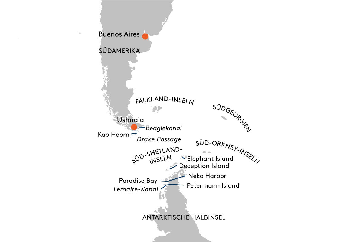- Die „Große Expeditionsoute“ umfasst 16 Tage auf See, mit An- und Abreise sind es 20 Tage. Die etwas kompaktere Reise bietet trotzdem alle Highlights einer Antarktisreise, allerdings kürzere Stopps auf den Falkland Inseln und auf Südgeorgien.