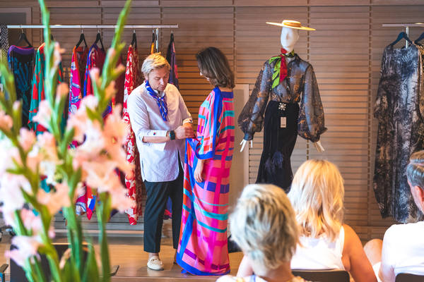 Um seine Kollektion vorzuführen, ist Dawid Tomaszewski mit einem mehrköpfigen Team an Bord. Für Fitting und Choreographie ist die Stylistin Julia Freitag dabei, um Haare und Make-Up kümmert sich Dimitris Dimitrakoudis mit seiner kleinen Truppe. Bei Hapag-Lloyd Cruises verantwortet die künstlerische Leiterin Susanna Kitzl diese Formatreise. Sie berichtet von den intensiven Vorbereitungen, von diversen Meetings, logistischen Herausforderungen und dem Aufbau einer vom Fashion Council Germany kuratierten Pop-up Boutique, die sich ganz harmonisch in das Studio auf Deck 9 einfügt. Susanna Kitzl: „Es ist unser Bestreben, den Gästen immer wieder auch Einzigartiges zu bieten. Und wenn ich die Begeisterung hier sehe oder in den Workshops, dann freut es mich, dass das Format so positiv angenommen wird.“