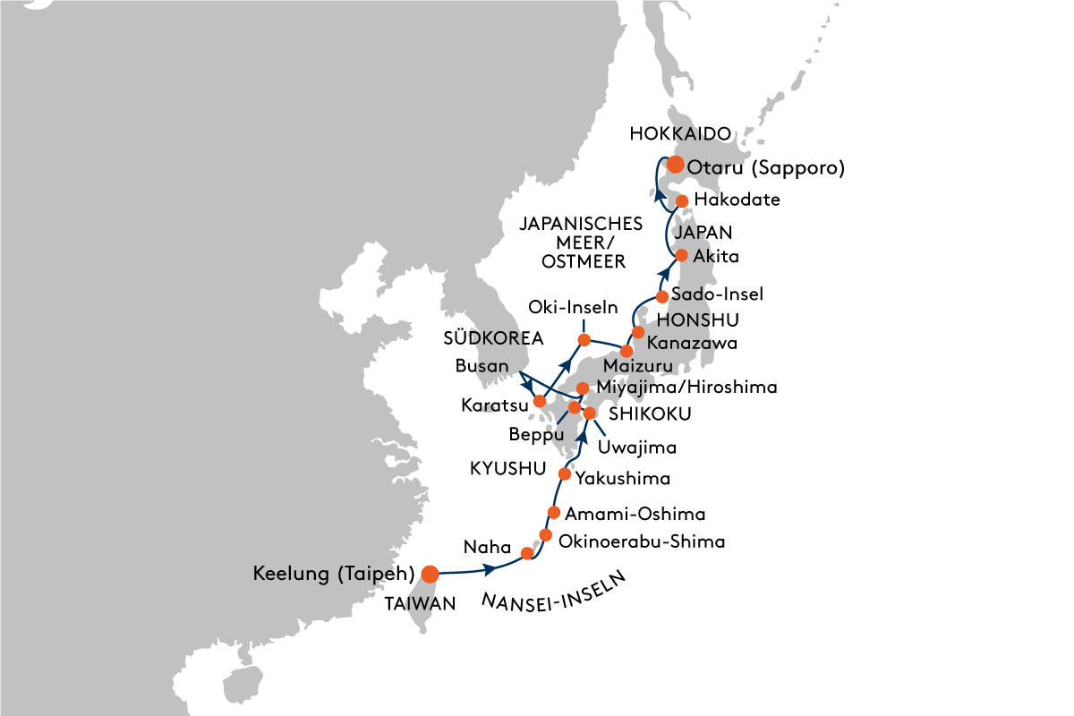 17. Mai bis 5. Juni 2026 – in 19 Tagen von Keelung (Taipeh) nach Otaru: Japans „Südsee-Inseln“, die selten besuchte Westküste und die geheimnisvolle Natur Yakushimas. Höhepunkte sind Begegnungen mit uralten Samurai-Traditionen, spirituelle Schreine, heiße Quellen in Beppu sowie ein Abstecher nach Südkorea mit dem Tempel von Busan.
