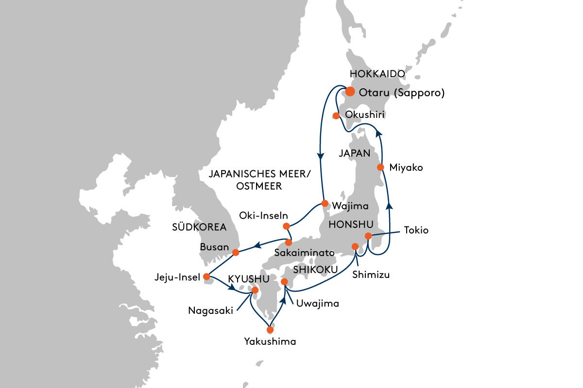 5. bis 21. Juni 2026 – in 16 Tagen umrundet unser kleines Expeditionsschiff das gesamte Inselreich, alle vier Hauptinseln, inklusive Abstecher nach Südkorea: vom Zen-Kloster in Tsuruga über die Gärten Kyotos bis zu Tokios futuristischen Silhouetten. Zahlreiche Wanderungen, Naturerlebnisse und kulturelle Begegnungen machen diese Route zu einer Expedition, die selbst Kenner überrascht.