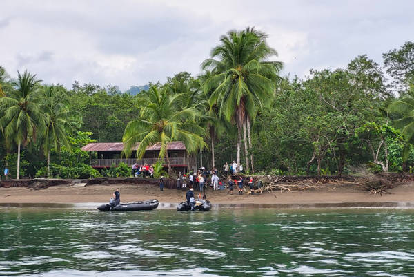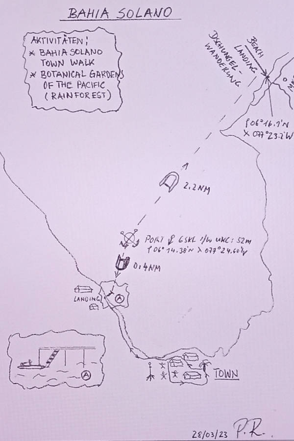 Nachdem die Behörden die HANSEATIC inspiration freigegeben haben, begeben sich unsere Gäste auf ihre Ausflüge. 110 haben sich für den „Bahia Solano Town Walk“ entschieden, 40 für die „Botanical Gardens of Pacific“, und 40 weitere nehmen an der Regenwaldwanderung teil. Zudem wird ein kontinuierlicher Shuttle in die kleine Hafenstadt angeboten. Die Natur hier ist überbordend schön und das Meer ein beliebter Tauch-Spot.